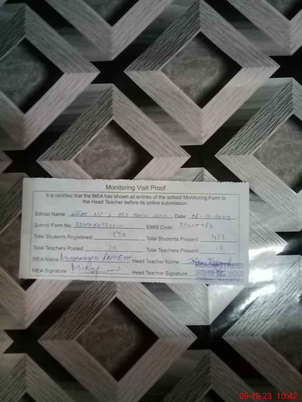 | Attendance Register | Head Teacher | MEA with School | Visit Proof |