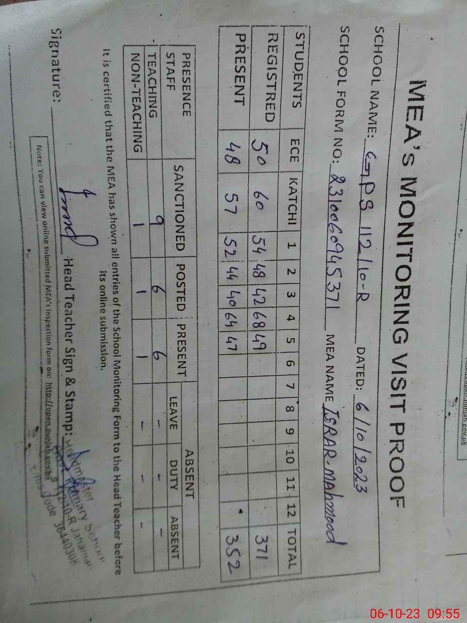 | Attendance Register | Head Teacher | MEA with School | Visit Proof |