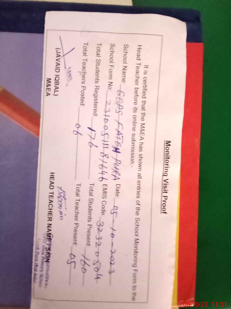 | Attendance Register | Head Teacher | MEA with School | Visit Proof |