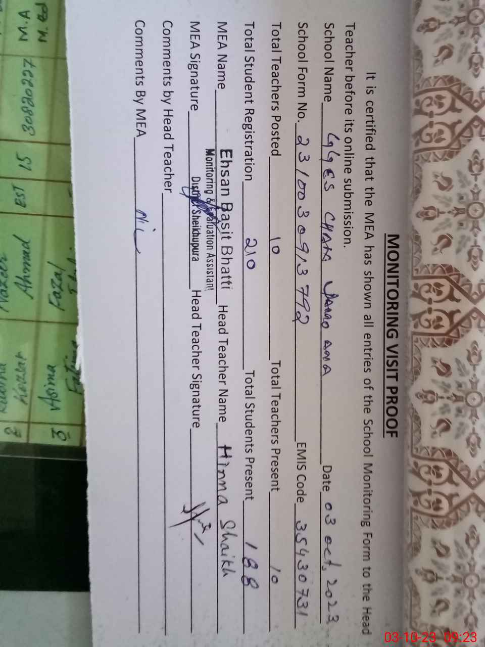 | Name: Hi**** Sh**** Designation: (School Headmaster's/Headmistress's) SST Sci Phone/Cell Number: 03**** |