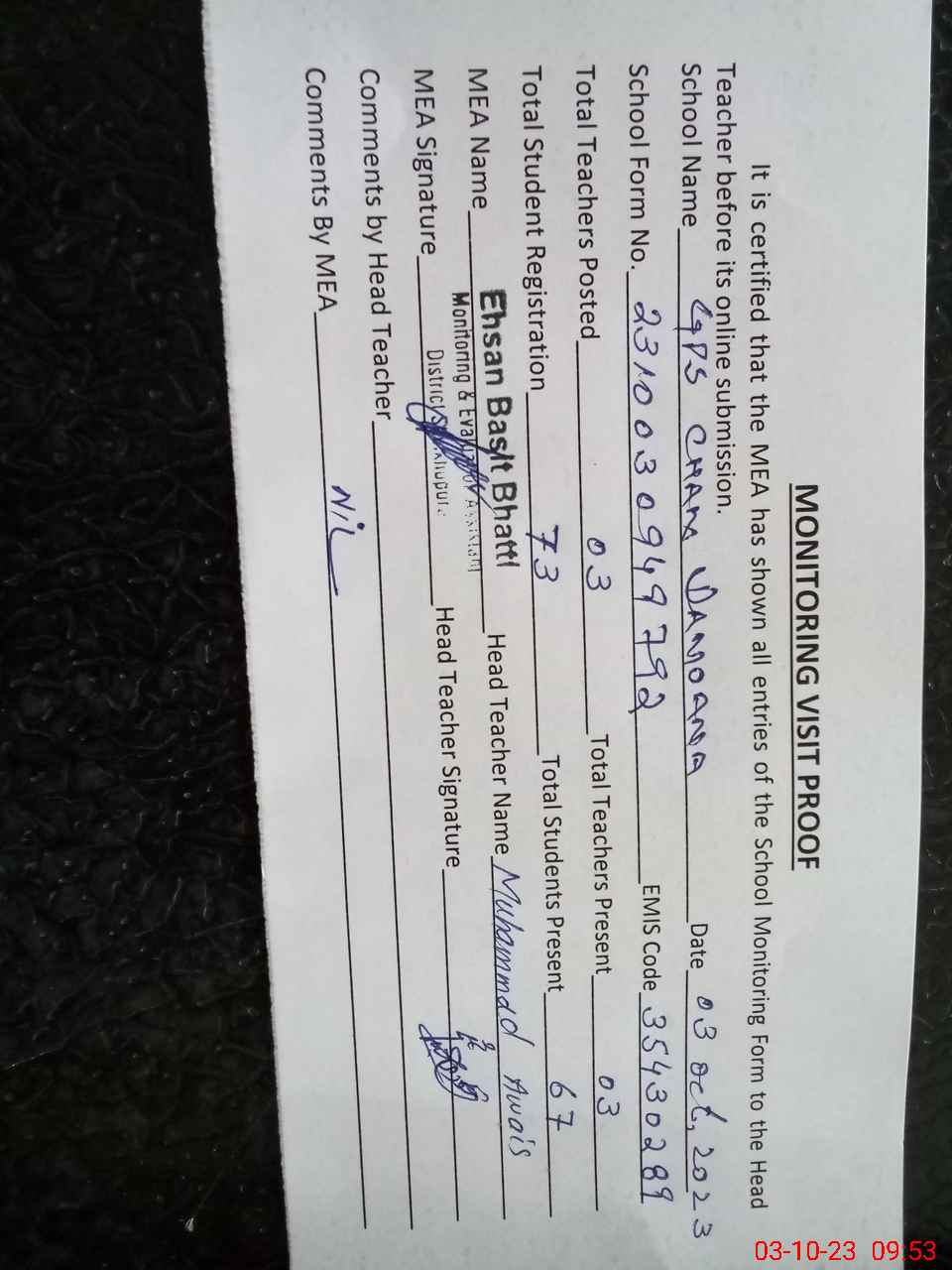 | Attendance Register | Head Teacher | MEA with School | Visit Proof |