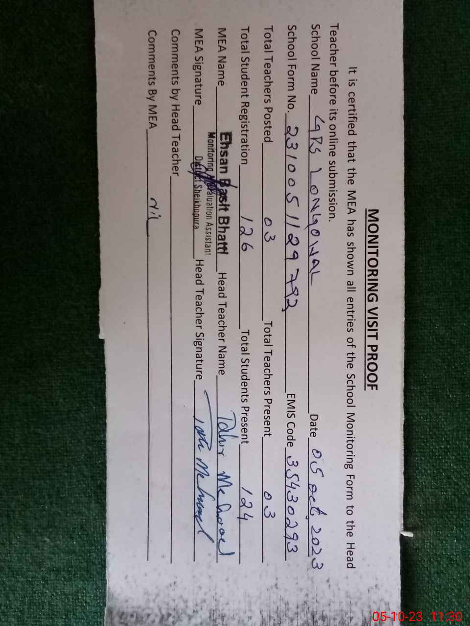 | Attendance Register | Head Teacher | MEA with School | Visit Proof |