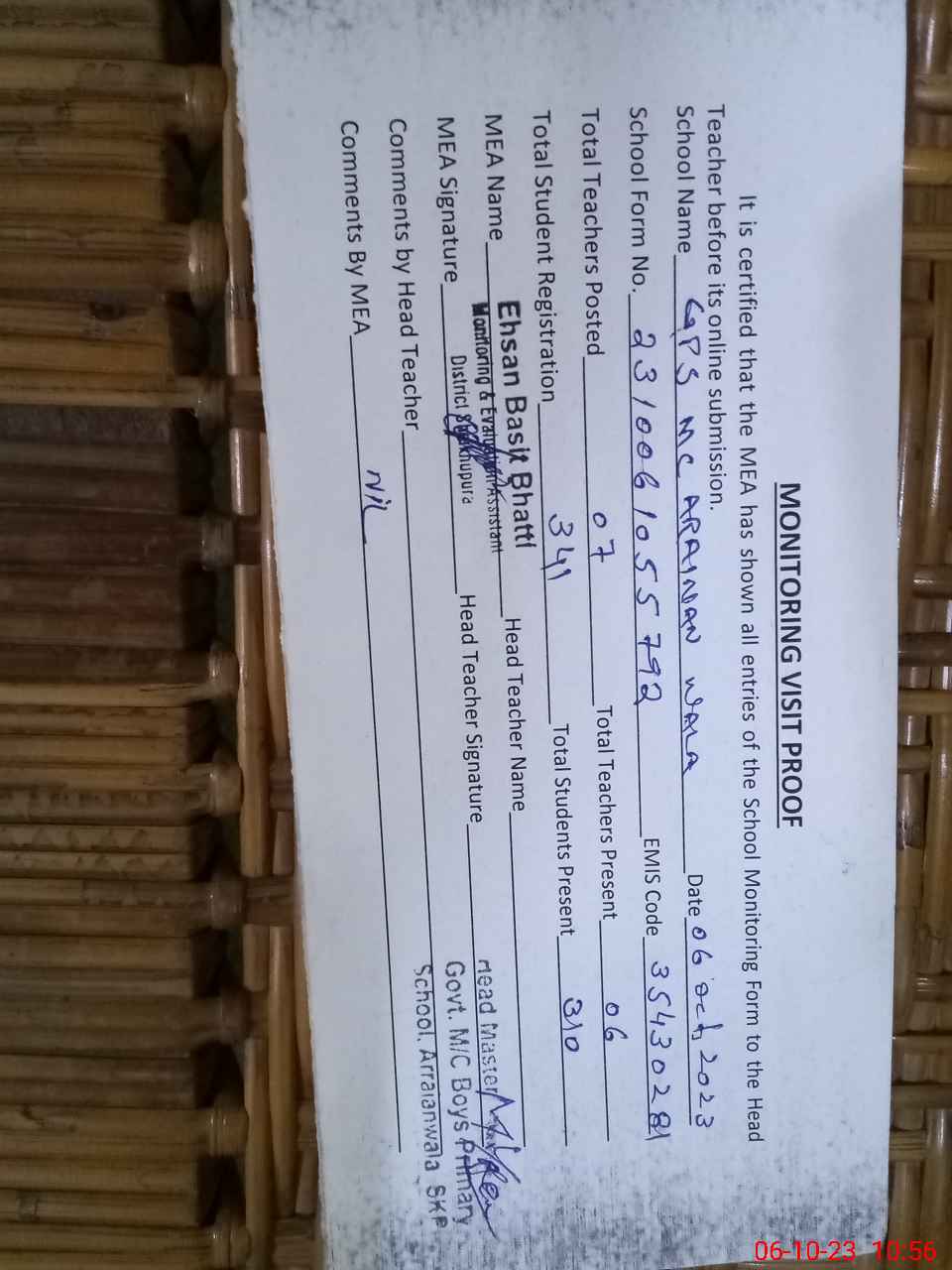 | Certified that this School was Inspected by the Undersigned MEA/DMO Today and the Information Stated Above is as Per Record. | |||||