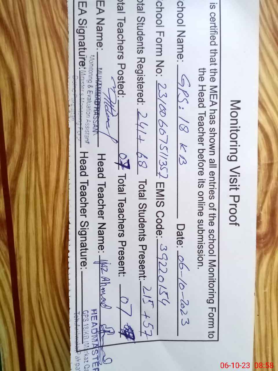 | EMIS Code: 39220154 | Name of School: GPS CHAK NO. 18 KB | |||