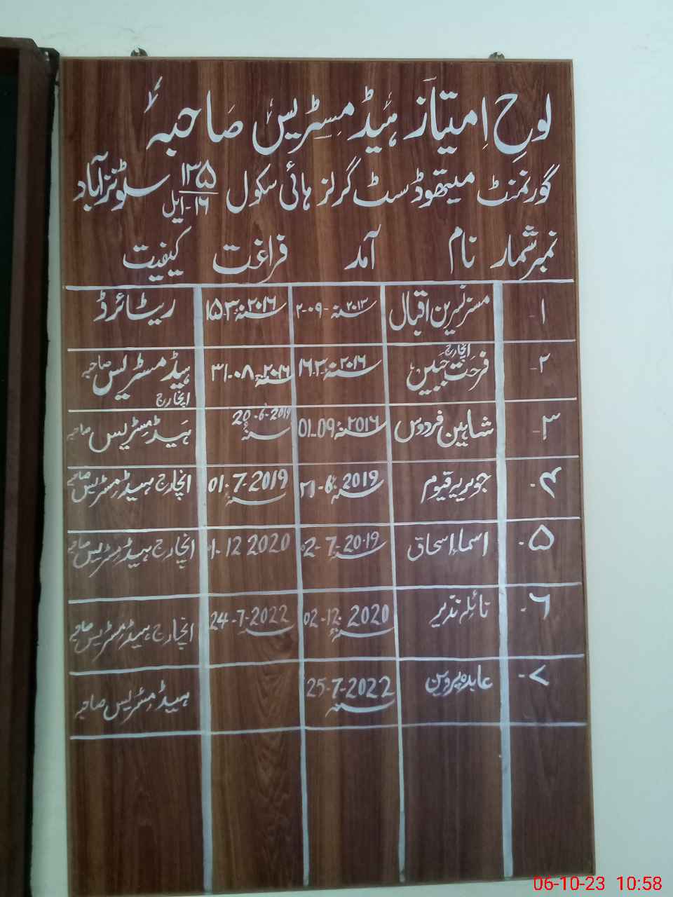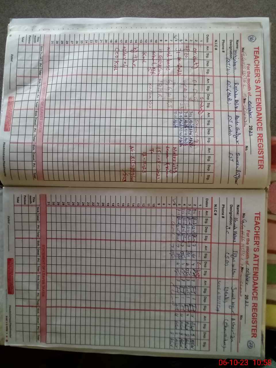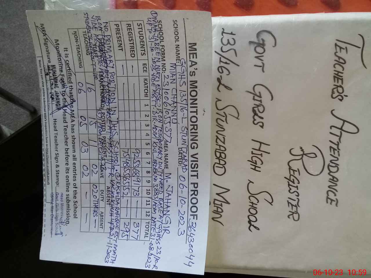 | Remarks (Use Separate Page if Required): MAH JABEEN NIAZI EST SC IS ON TEMPORARY DUTY NEED BASE AT GGHSS 23 10R KACHA KHUH UPTO 31 OCTOBER 2023 VIDE ASSTT DIRECTOR ADMIN KHANEWAL ORDER NO 3883 ADMN DATED 31 AUGUST 2023 AND RASHIDA RAFIQUE EST SC IS ON TEMPORARY DUTY NEED BASE AT GGHSS 19 9R KACHA KHUH UPTO 21 NOVEMBER 2023 VIDE ASSTT DIRECTOR ADMIN KHANEWAL ORDER NO 4371 ADMN DATED 21 SEPTEMBER 2023 NO PRIMARY PORTION IN THIS SCHOOL NSB GRANTS AND FTF RECORDS ARE NOT AVAILABLE ONE TOILET IS LOCKED BLOCKED AND NON FUNCTIONAL RANDOM CLASS SEVEN IS NOW IN CLASS NINE | |||||