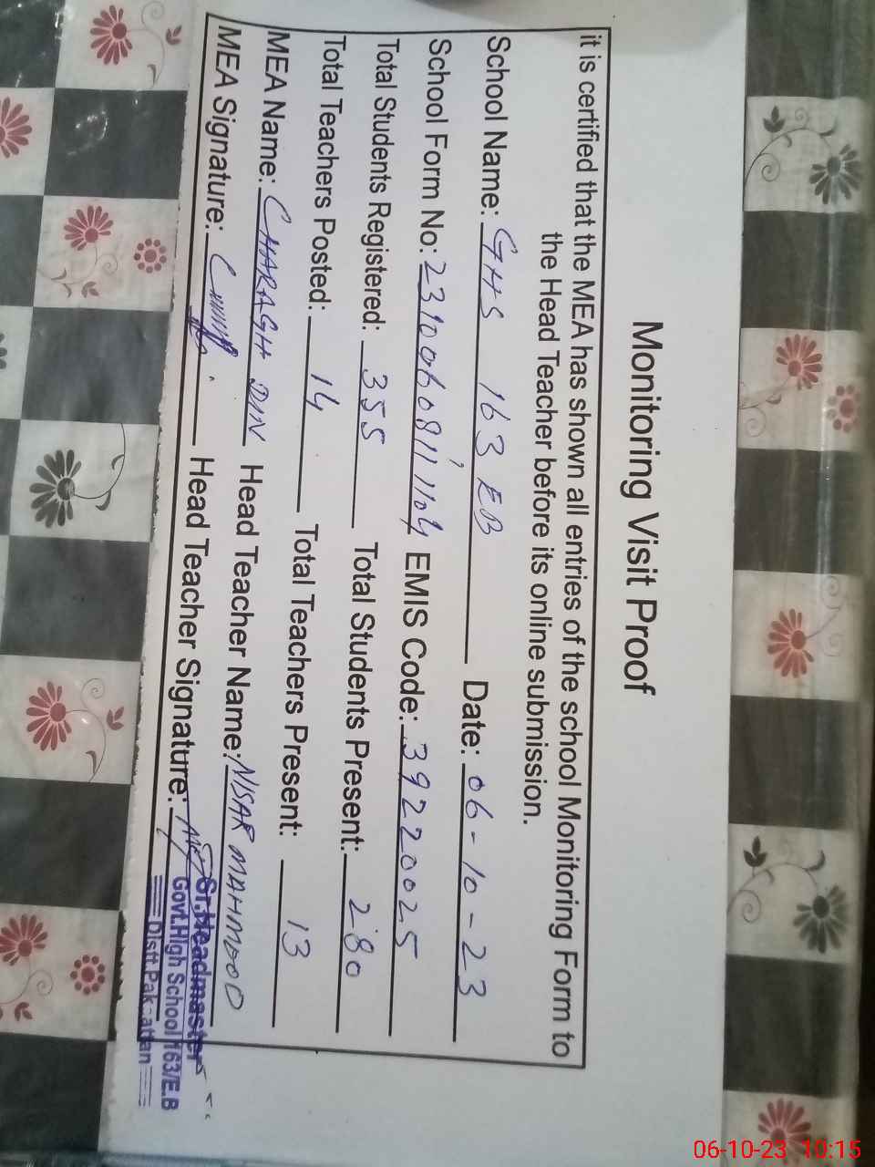 | Certified that this School was Inspected by the Undersigned MEA/DMO Today and the Information Stated Above is as Per Record. | |||||