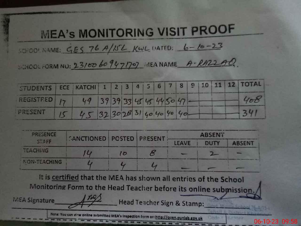 | Attendance Register | Head Teacher | MEA with School | Visit Proof |