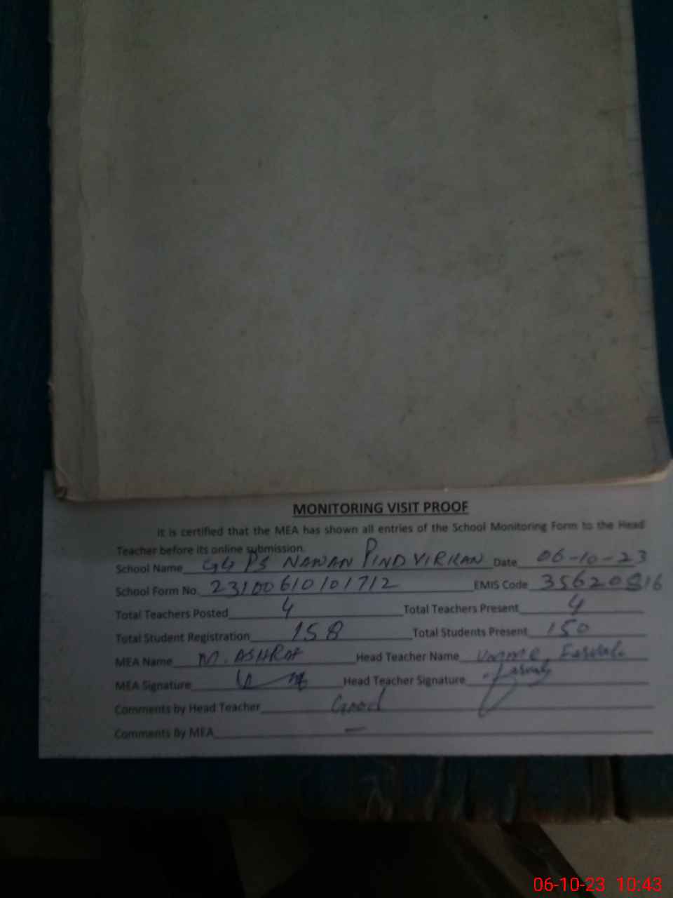 | Attendance Register | Head Teacher | MEA with School | Visit Proof |