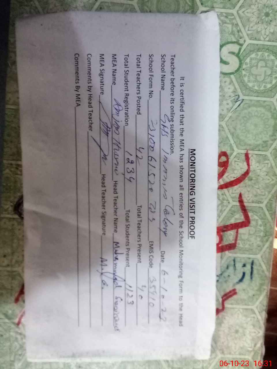 | Attendance Register | Head Teacher | MEA with School | Visit Proof |