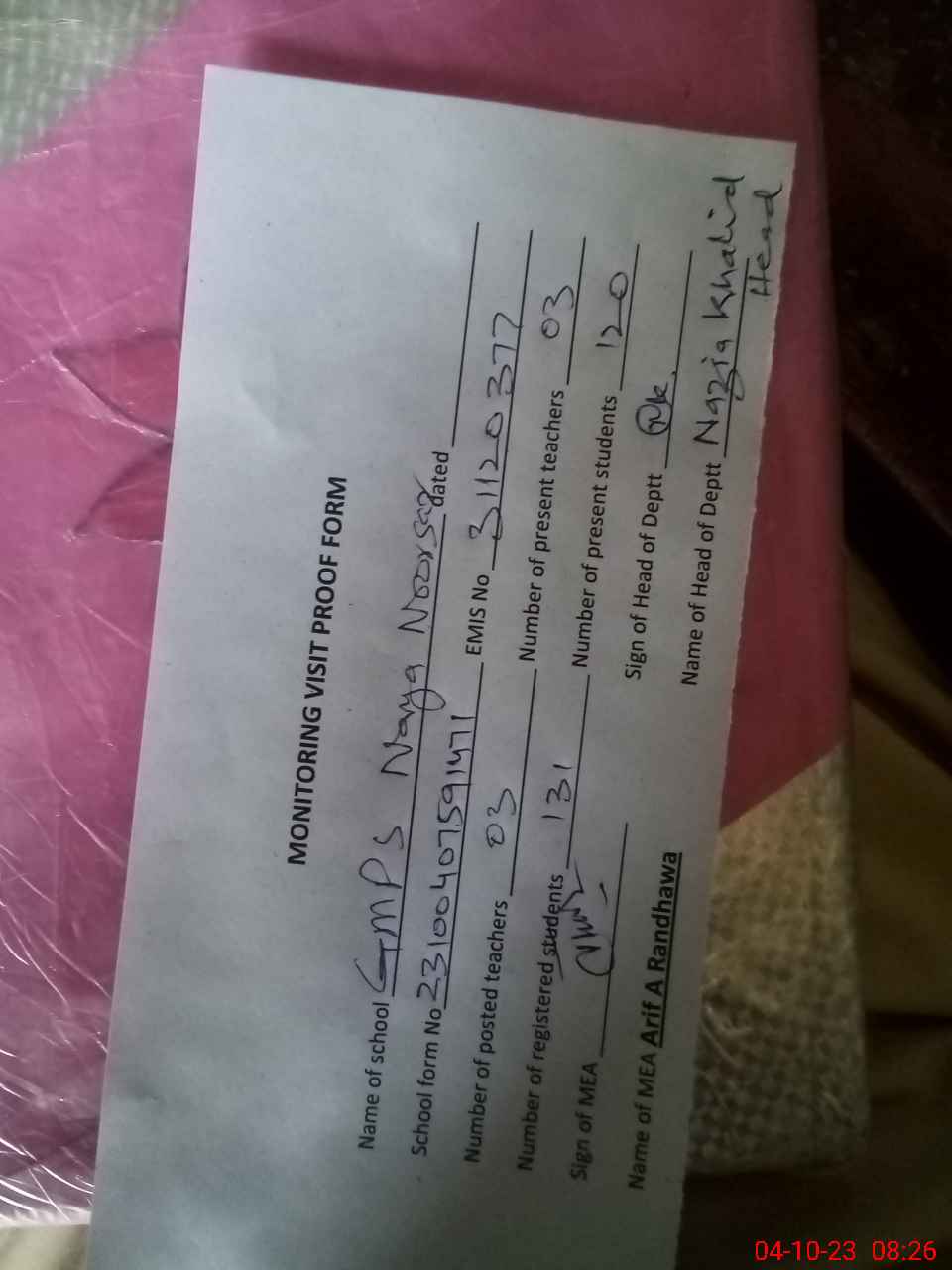 | EMIS Code: 31110377 | Name of School: GMPS NIYA NOORSAR | |||
