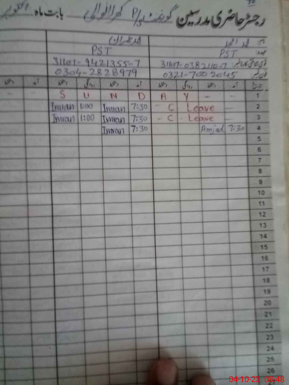 | CNIC | Full Name | Designation | R/C | Absence During Last Calender Month |