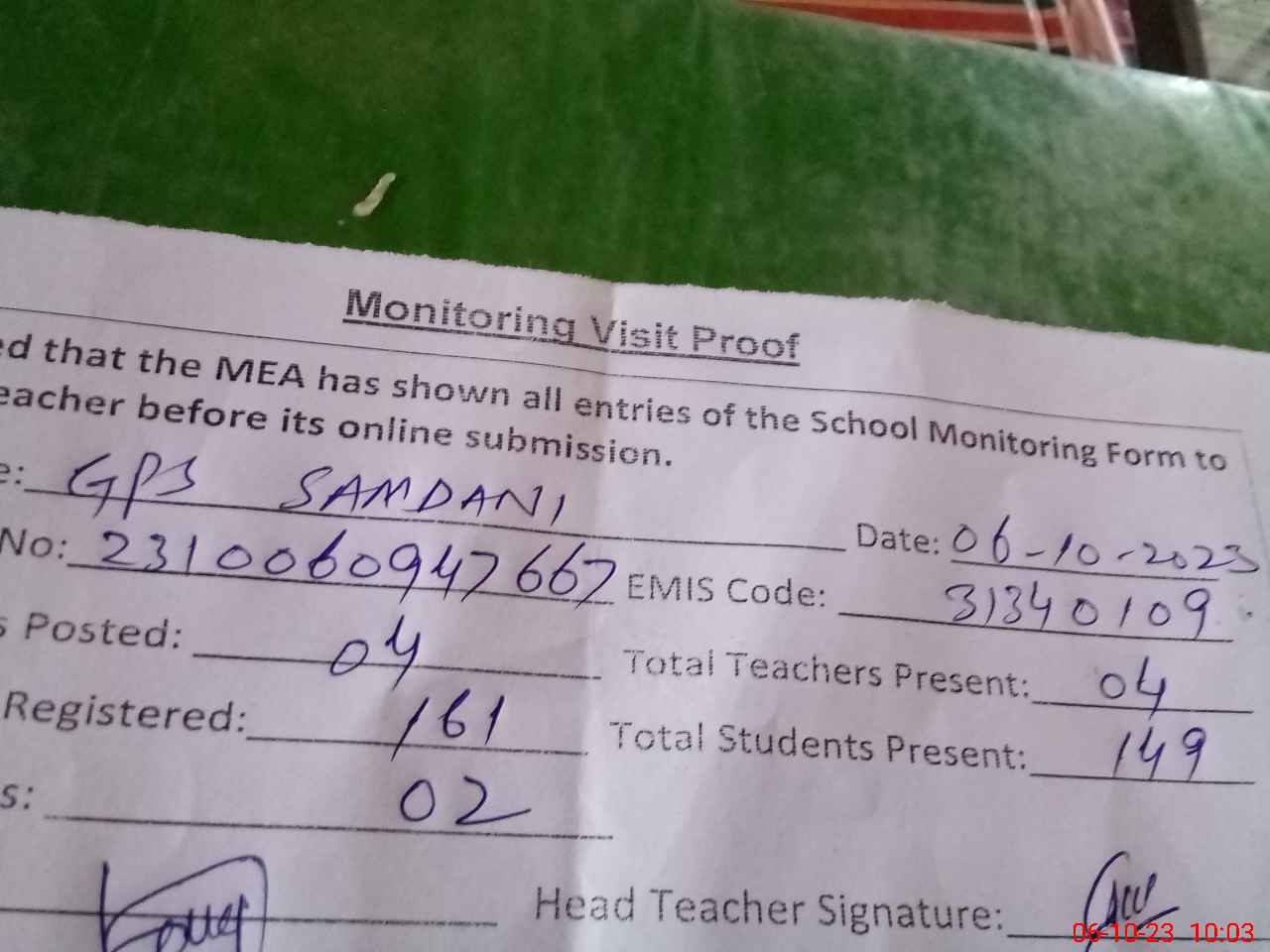 | Attendance Register | Head Teacher | MEA with School | Visit Proof |