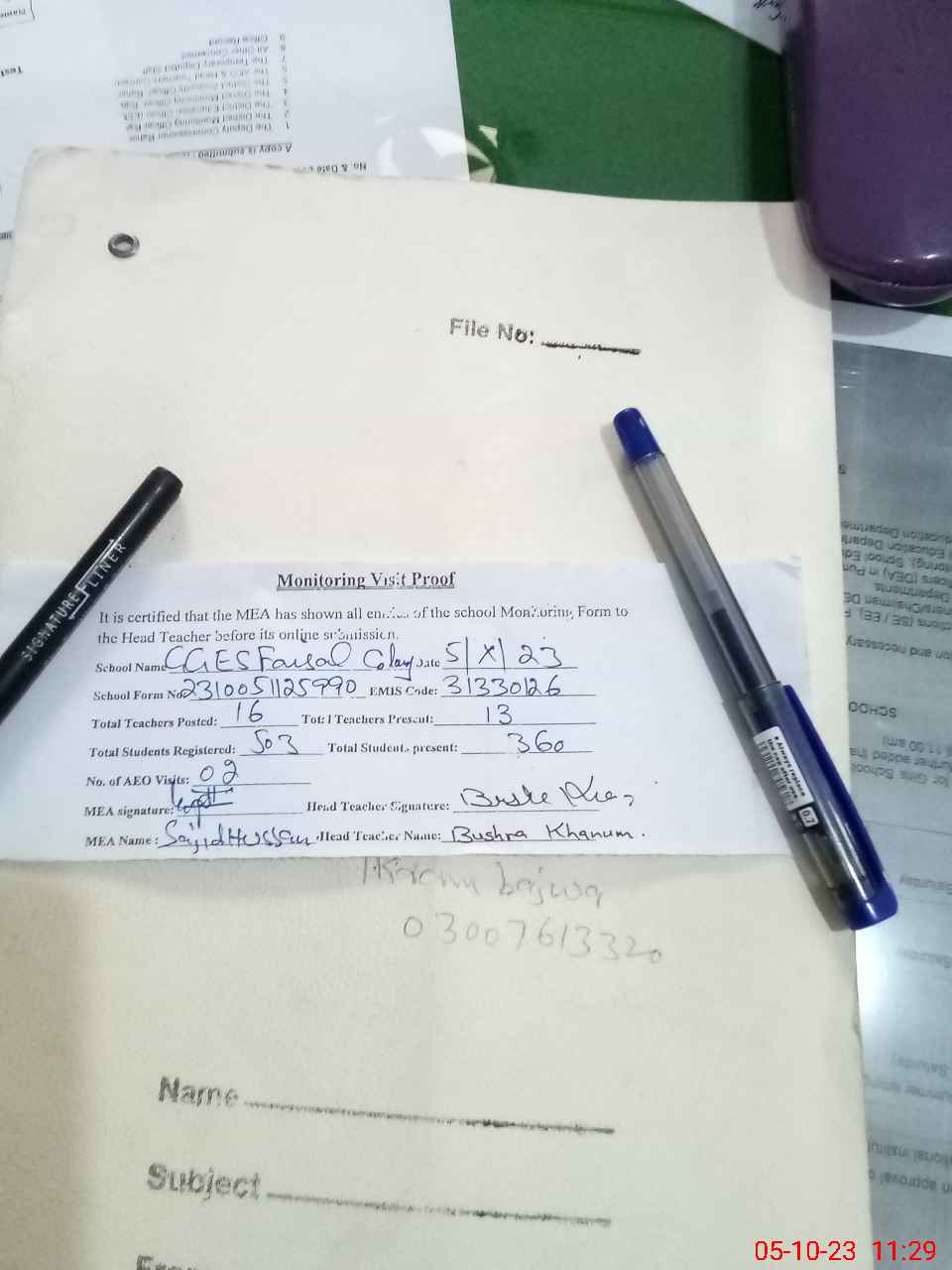| Attendance Register | Head Teacher | MEA with School | Visit Proof |