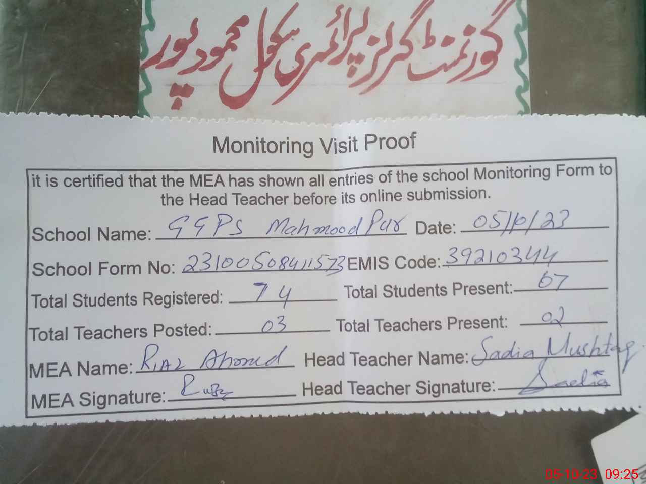 | EMIS Code: 39210344 | Name of School: GGPS MAHMOOD PUR | |||
