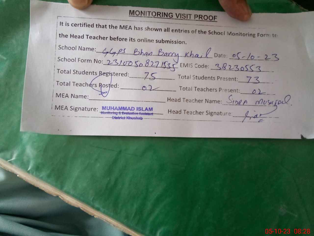 | Attendance Register | Head Teacher | MEA with School | Visit Proof |