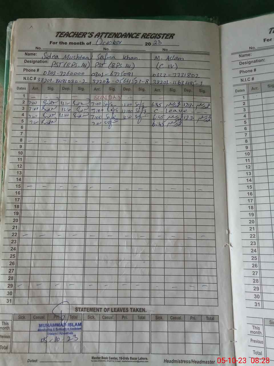 | CNIC | Full Name | Designation | R/C | Absence During Last Calender Month |