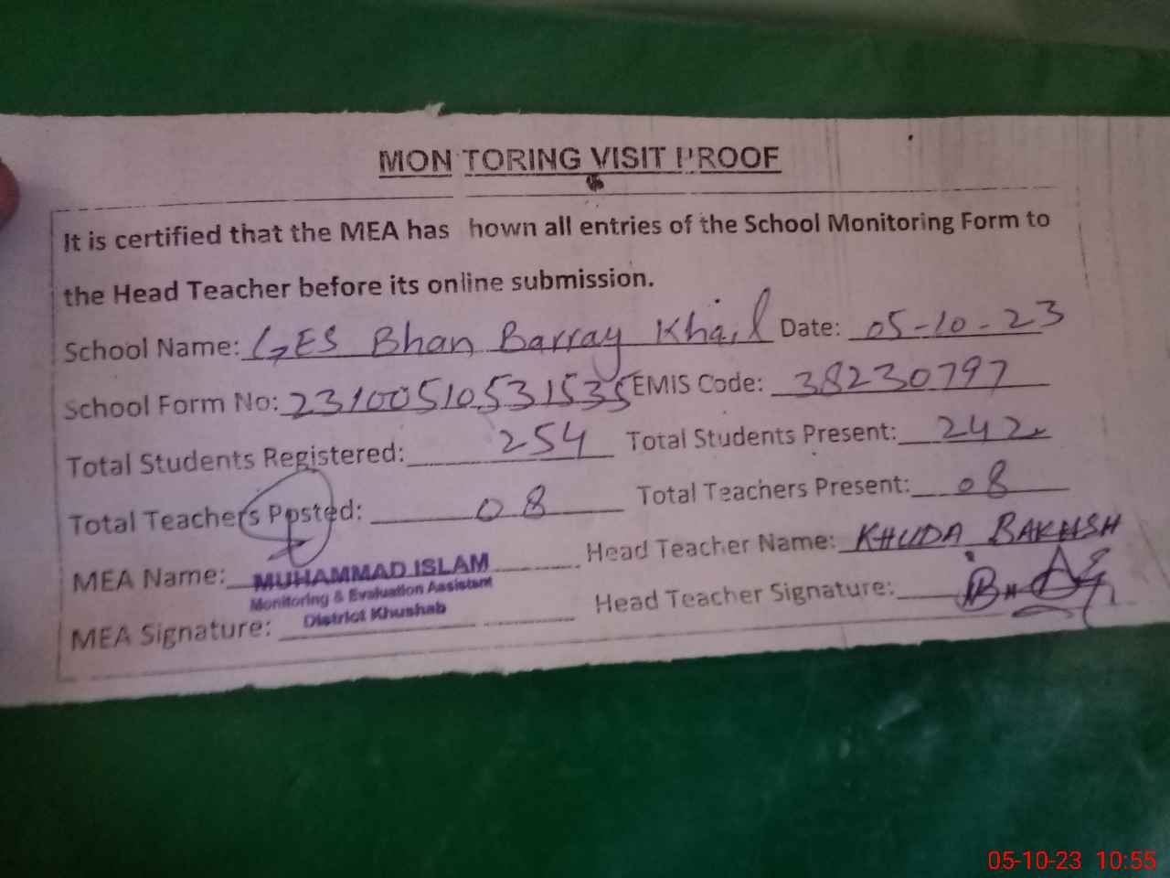 | Attendance Register | Head Teacher | MEA with School | Visit Proof |