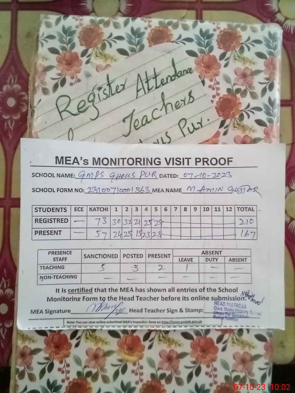 | Attendance Register | Head Teacher | MEA with School | Visit Proof |
