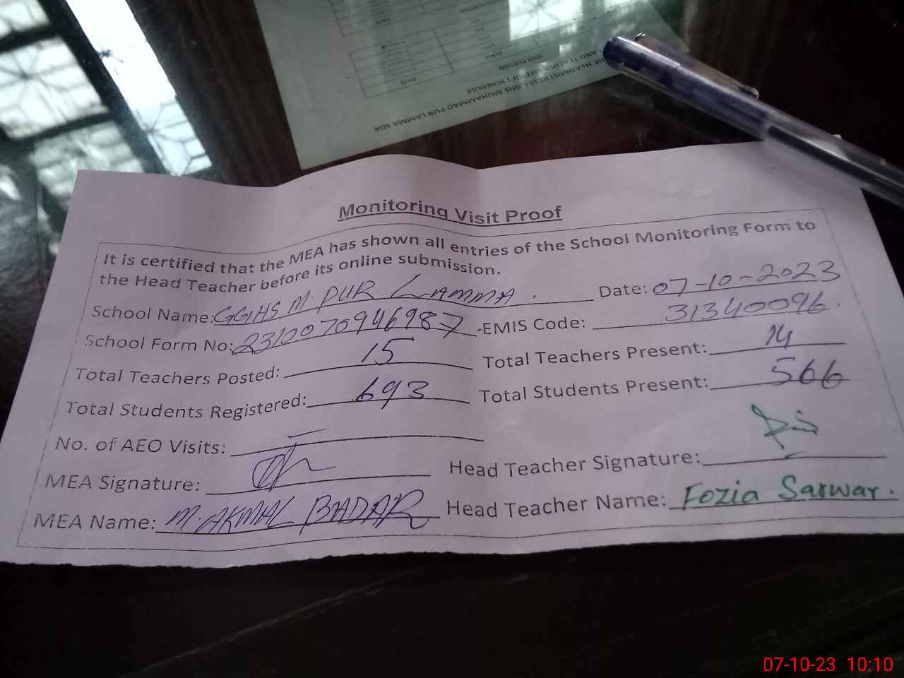 | Monitoring Date: 07-10-2023 | Start Time: 07-10-2023 09:45 AM | End Time: 07-10-2023 10:10 AM | Name of MEA: Mu**** Ak**** Ba**** | |