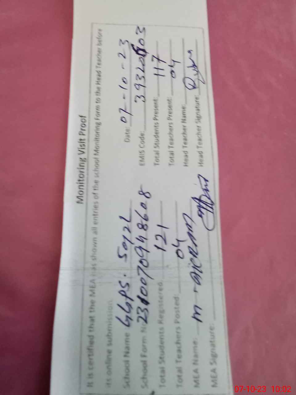 | Attendance Register | Head Teacher | MEA with School | Visit Proof |