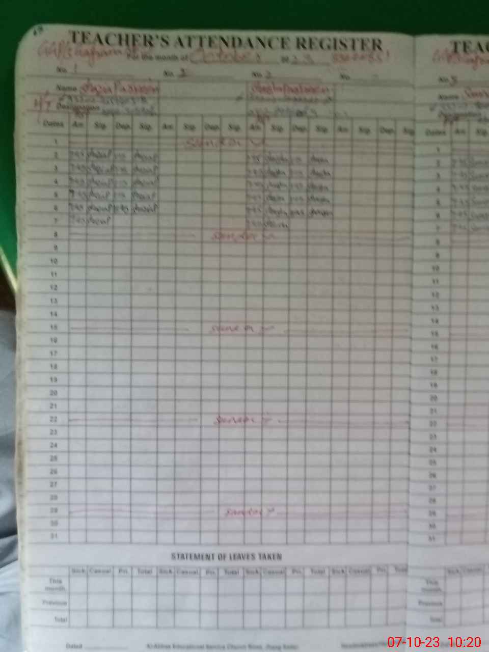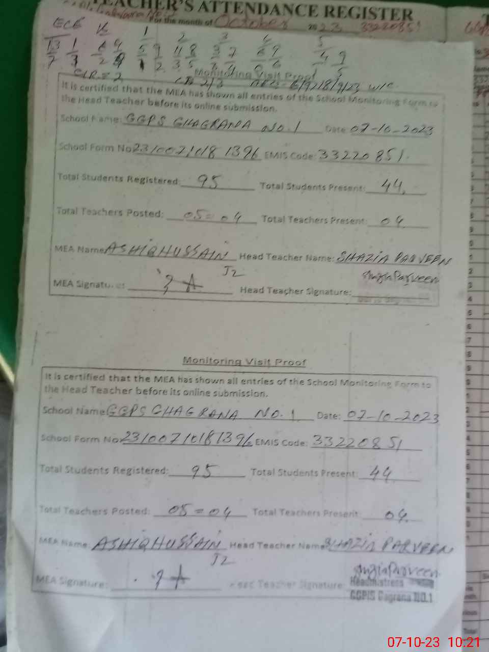 | Attendance Register | Head Teacher | MEA with School | Visit Proof |