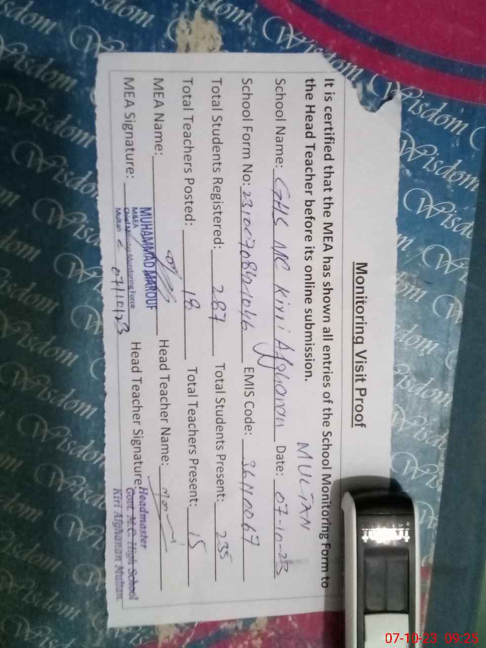 | EMIS Code: 36110067 | Name of School: GHS MC KIRRI AFGHANAN MULTAN | |||