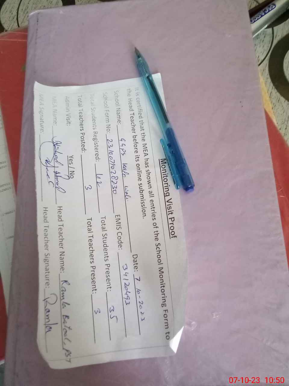 | Attendance Register | Head Teacher | MEA with School | Visit Proof |