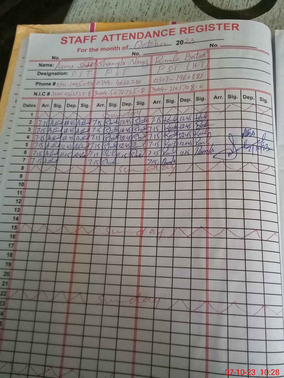 | CNIC | Full Name | Designation | R/C | Absence during last cal. month |