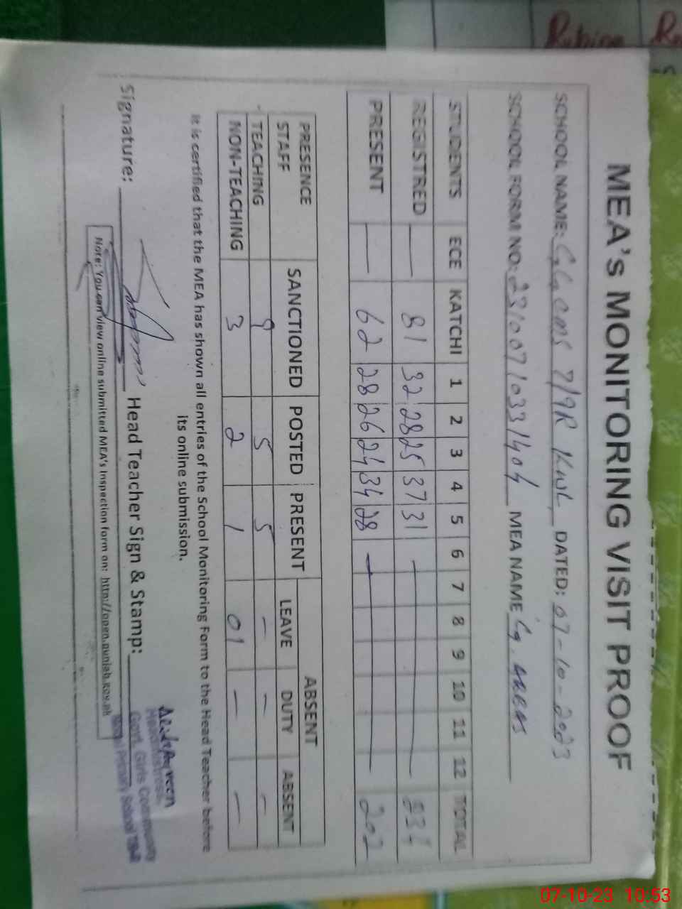 | Attendance Register | Head Teacher | MEA with School | Visit Proof |