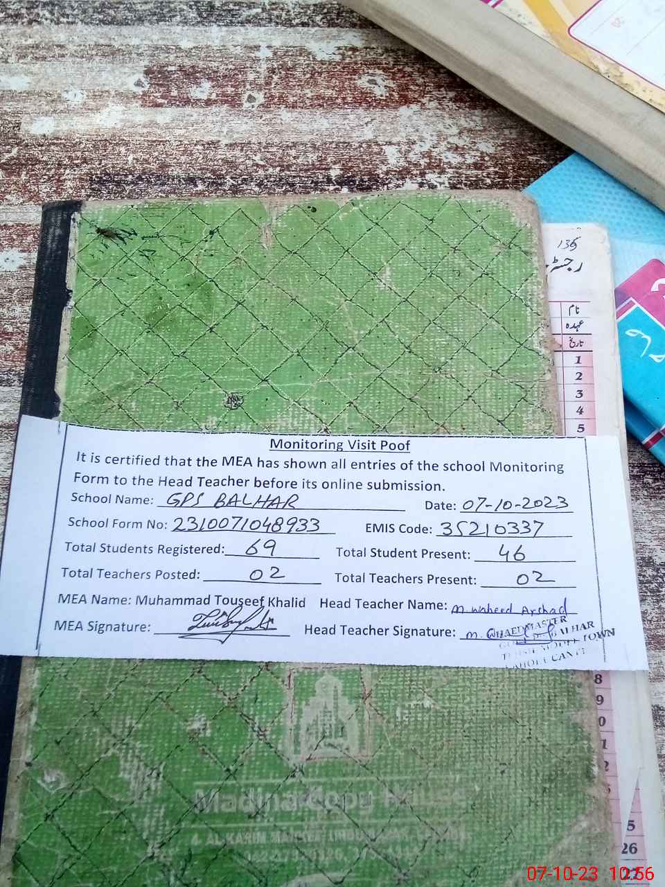 | EMIS Code: 35210337 | Name of School: GPS BALHAR TEHSIL MODEL TOWN | |||