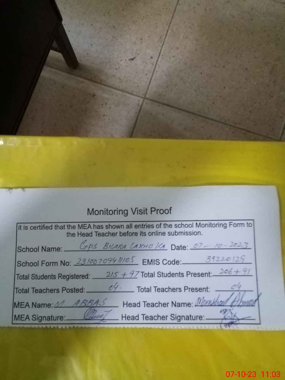 | Certified that this School was Inspected by the Undersigned MEA/DMO Today and the Information Stated Above is as Per Record. | |||||