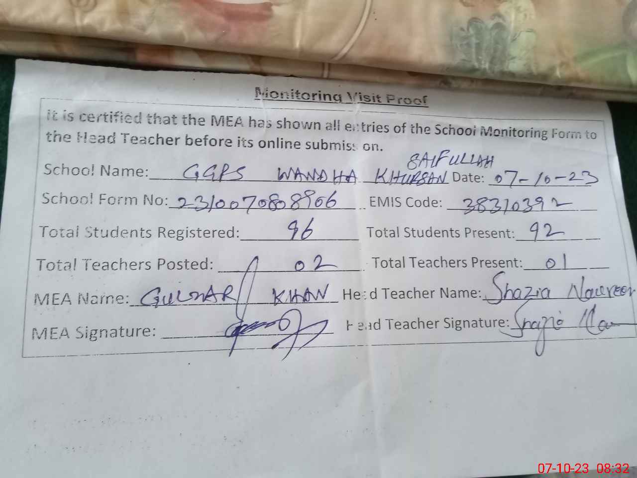 | EMIS Code: 38310392 | Name of School: GGPS WANDHA KHURASAN SAIF ULLAH | |||