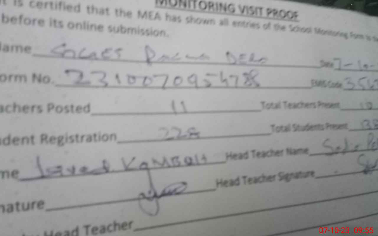 | Attendance Register | Head Teacher | MEA with School | Visit Proof |