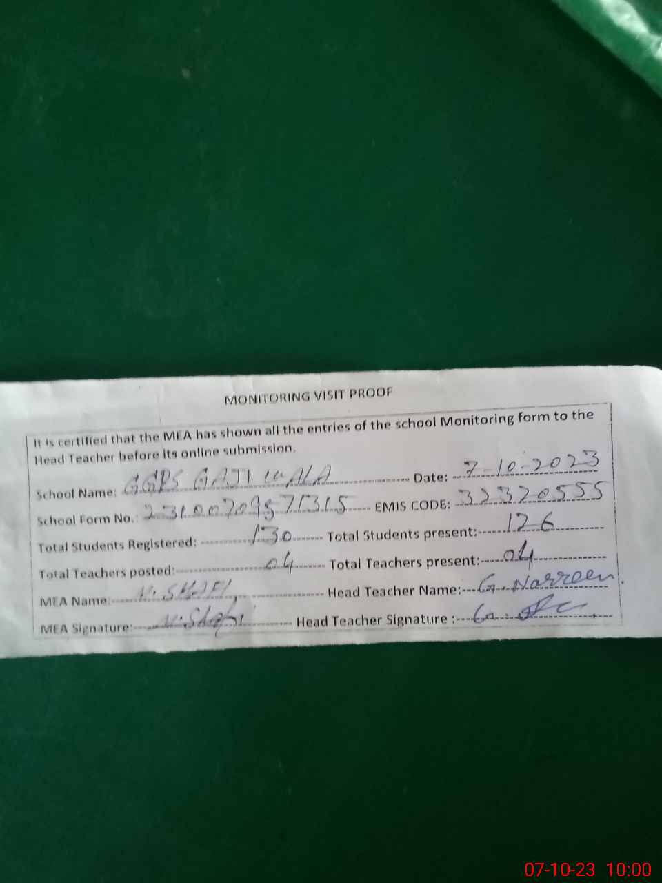 | EMIS Code: 32320555 | Name of School: GGPS GAJI WALA | |||