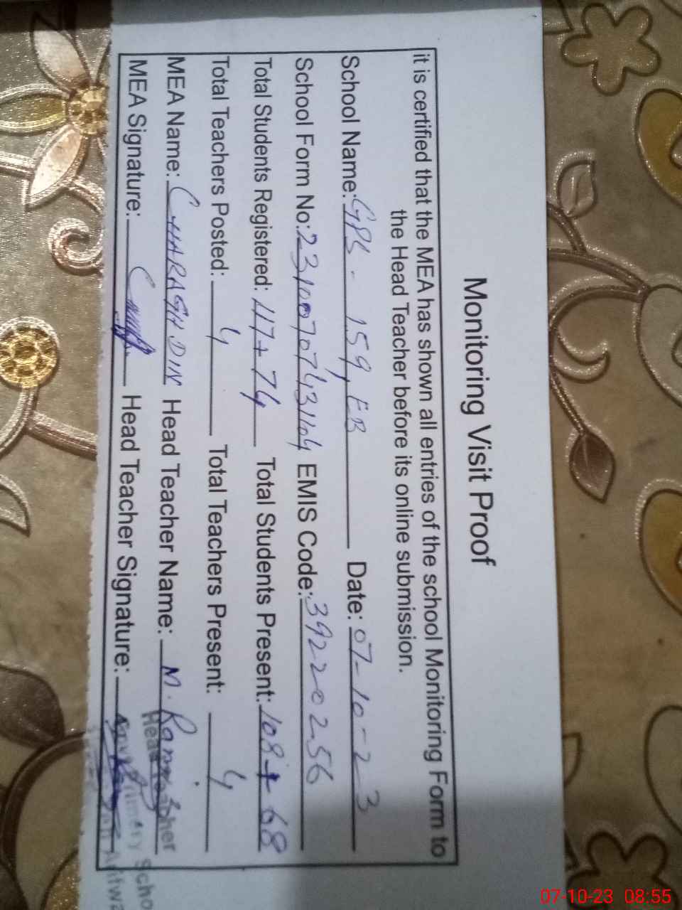 | EMIS Code: 39220256 | Name of School: GPS 159 EB P.O ARIF WALA | |||