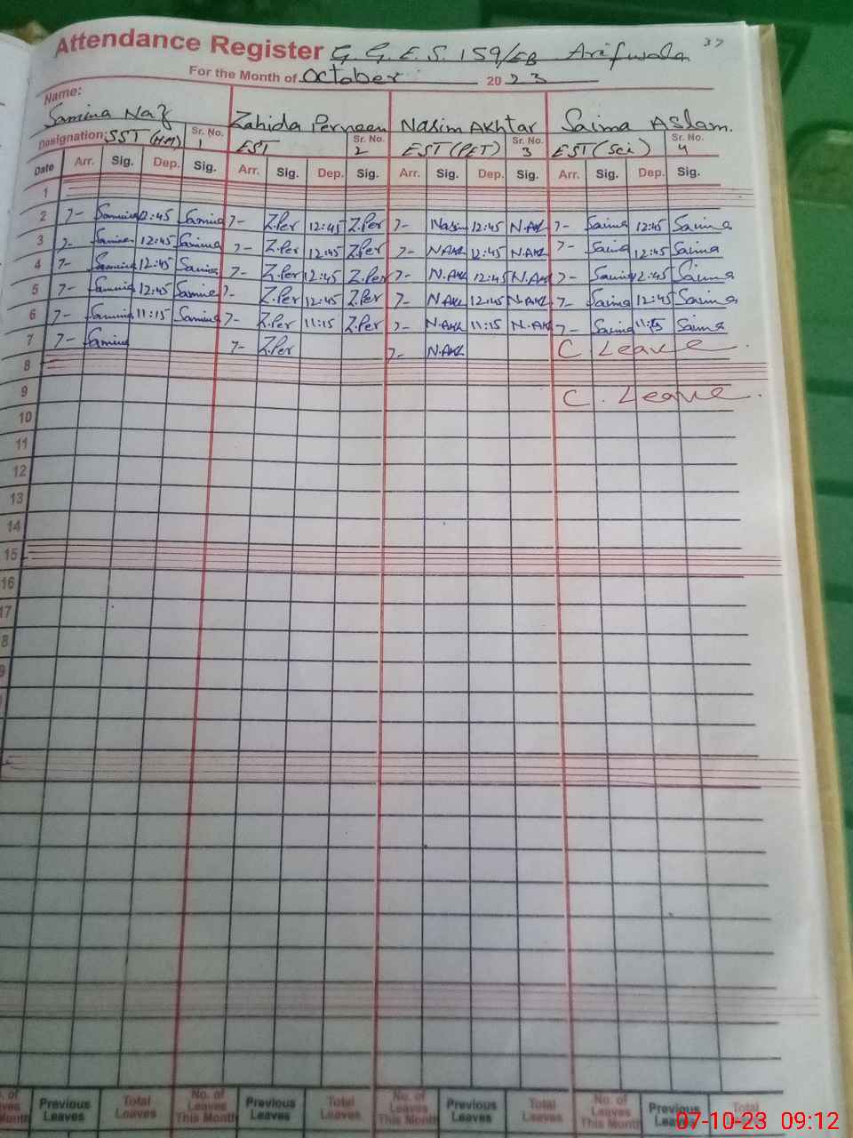 | CNIC | Full Name | Designation | R/C | Absence During Last Calender Month |