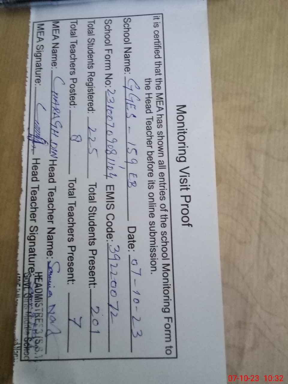 | Attendance Register | Head Teacher | MEA with School | Visit Proof |