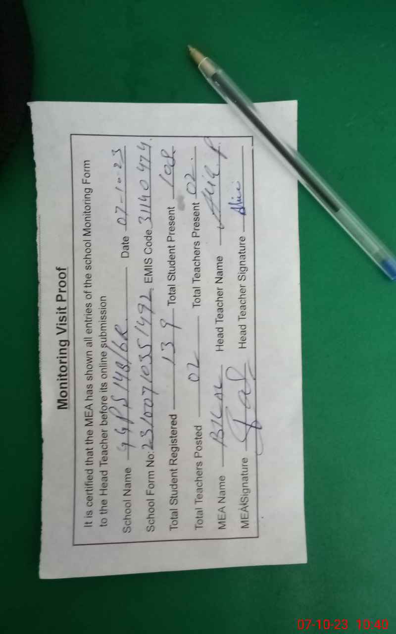 | Attendance Register | Head Teacher | MEA with School | Visit Proof |