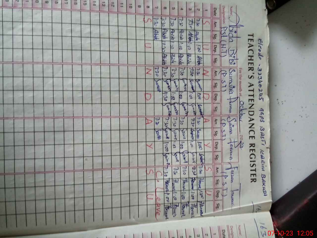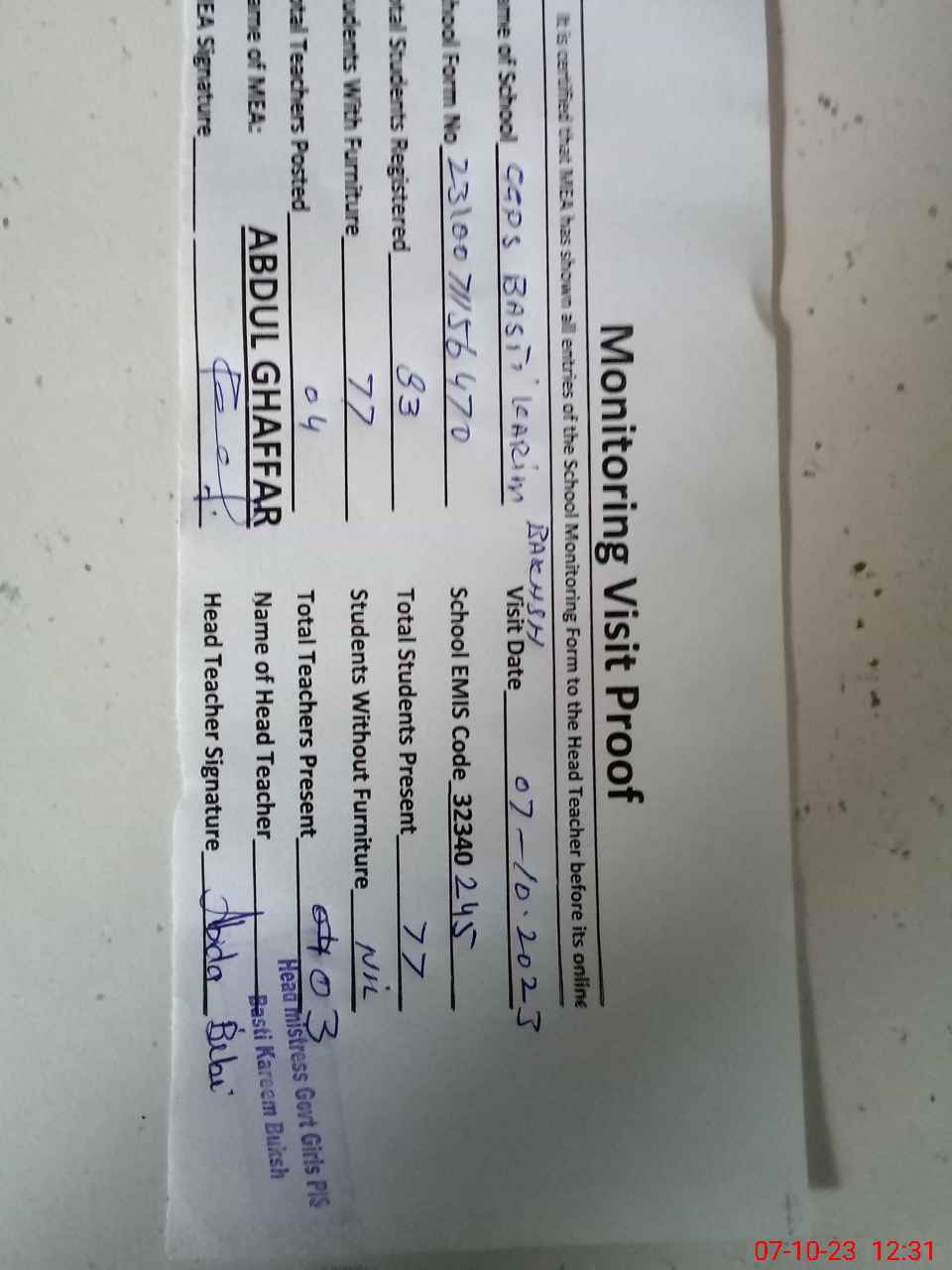 | Name: AB**** BI**** Designation: (School Headmaster's/Headmistress's) PST Phone/Cell Number: 03**** |