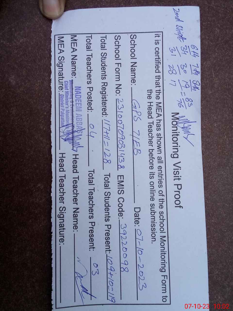 | Certified that this School was Inspected by the Undersigned MEA/DMO Today and the Information Stated Above is as Per Record. | |||||