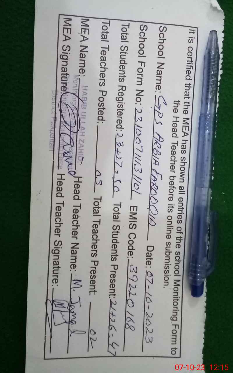 | EMIS Code: 39220168 | Name of School: GPS ARABIA FAROOQIA ARIFWALA J BLOCK | |||
