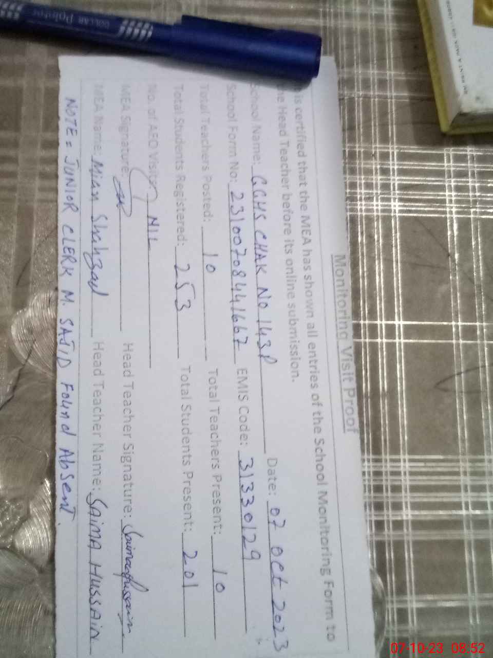 | Attendance Register | Head Teacher | MEA with School | Visit Proof |