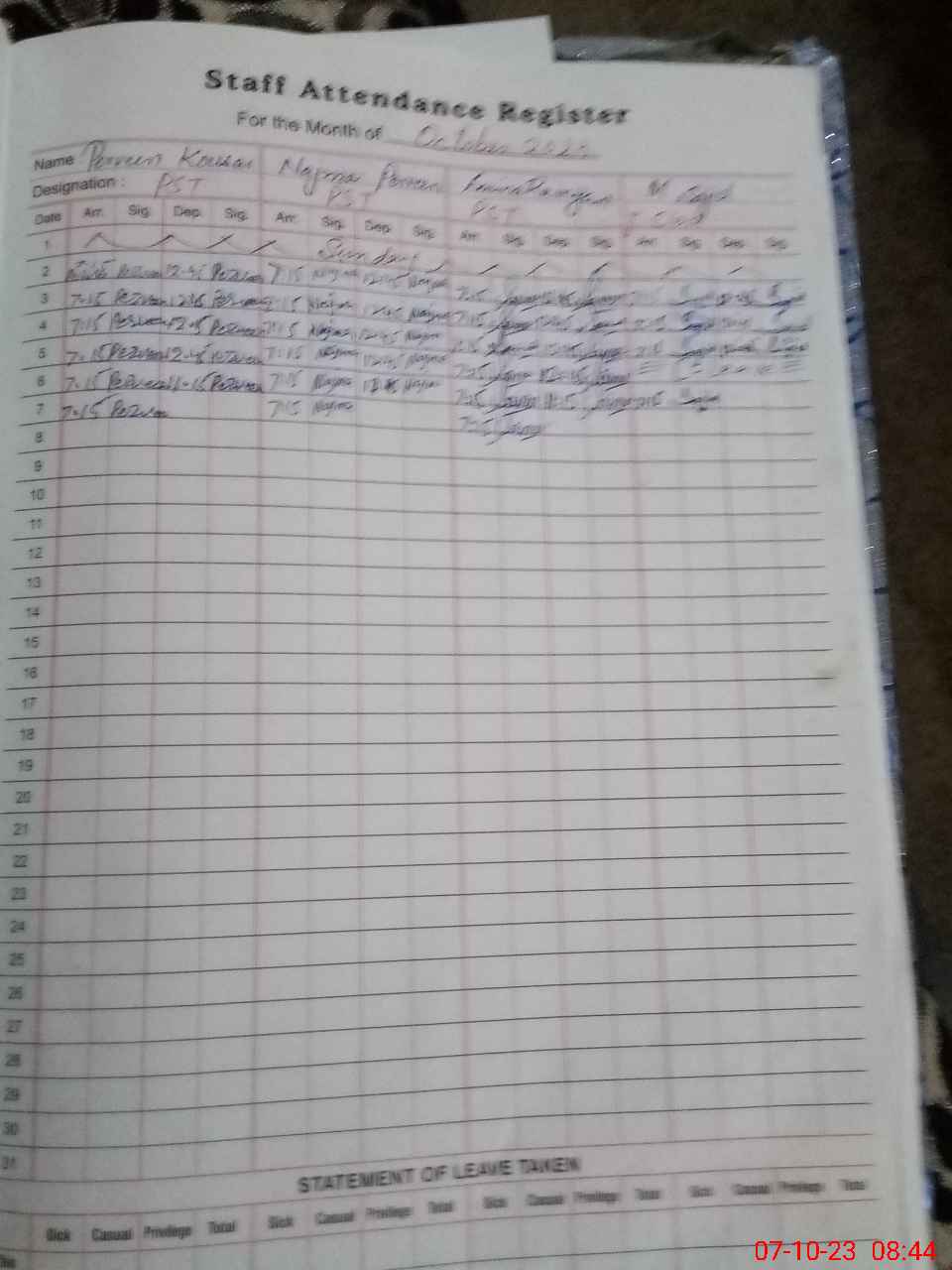 | 31**** | Mu**** Sa**** | JUNIOR CLERK | Regular | 0 | 23 | 0 | 0 | 0 | 0 | 0 | 0 | 0 | Absent (Un-Authorized) |