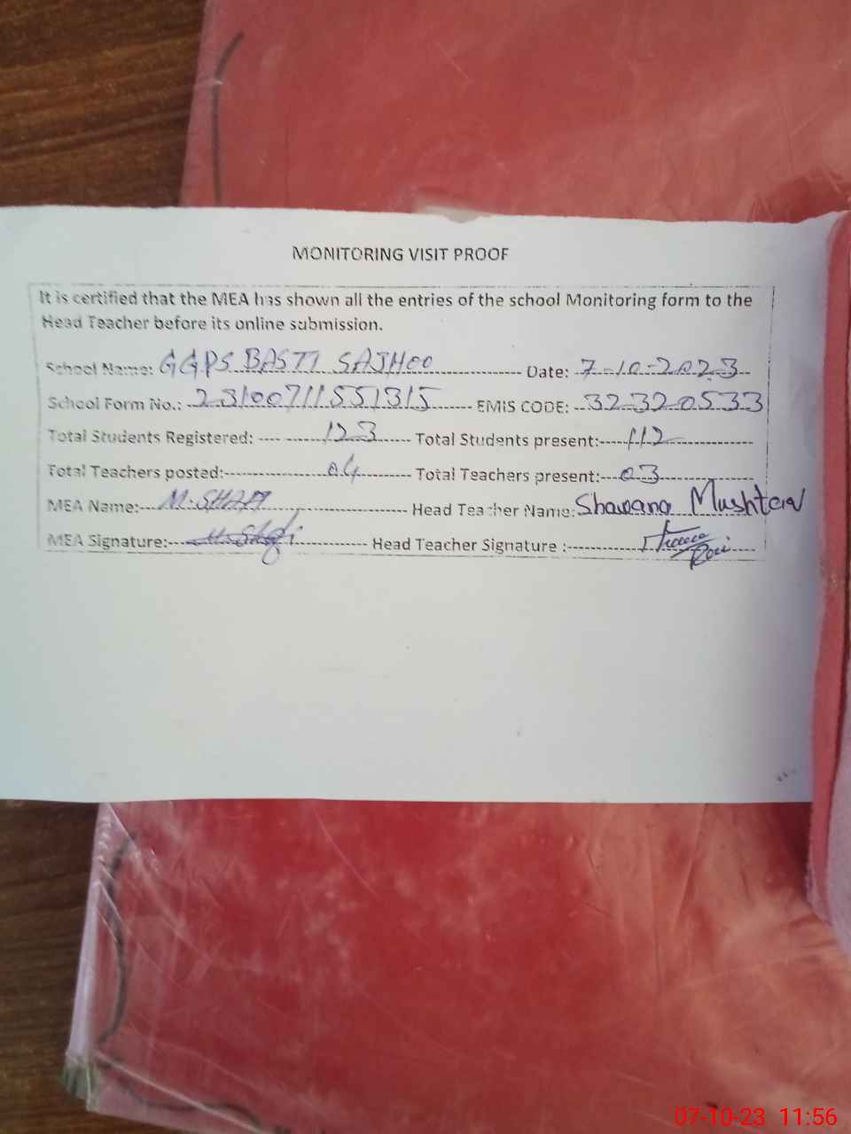 | Attendance Register | Head Teacher | MEA with School | Visit Proof |