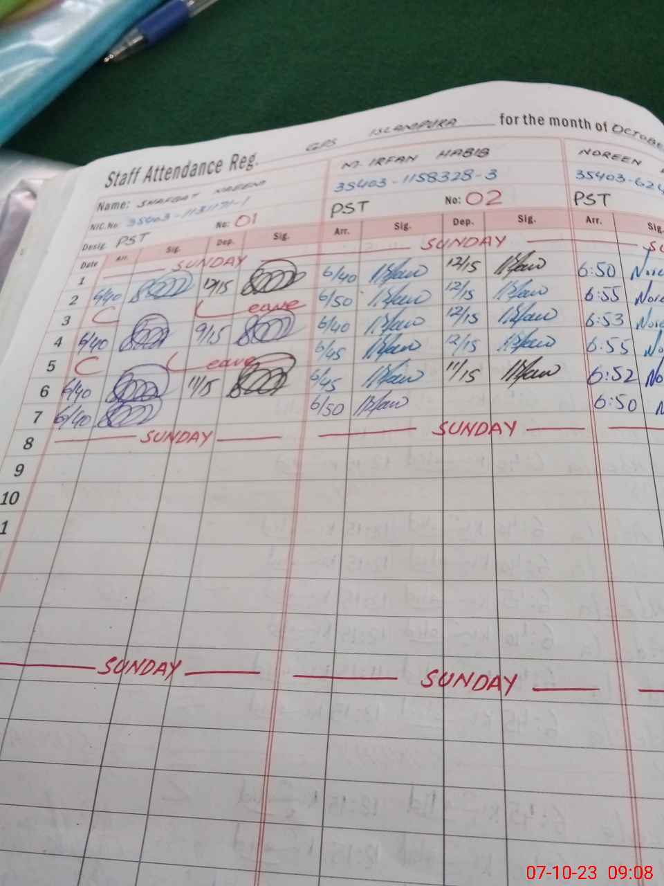 | CNIC | Full Name | Designation | R/C | Absence During Last Calender Month |