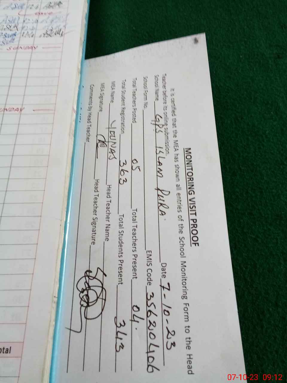 | Attendance Register | Head Teacher | MEA with School | Visit Proof |