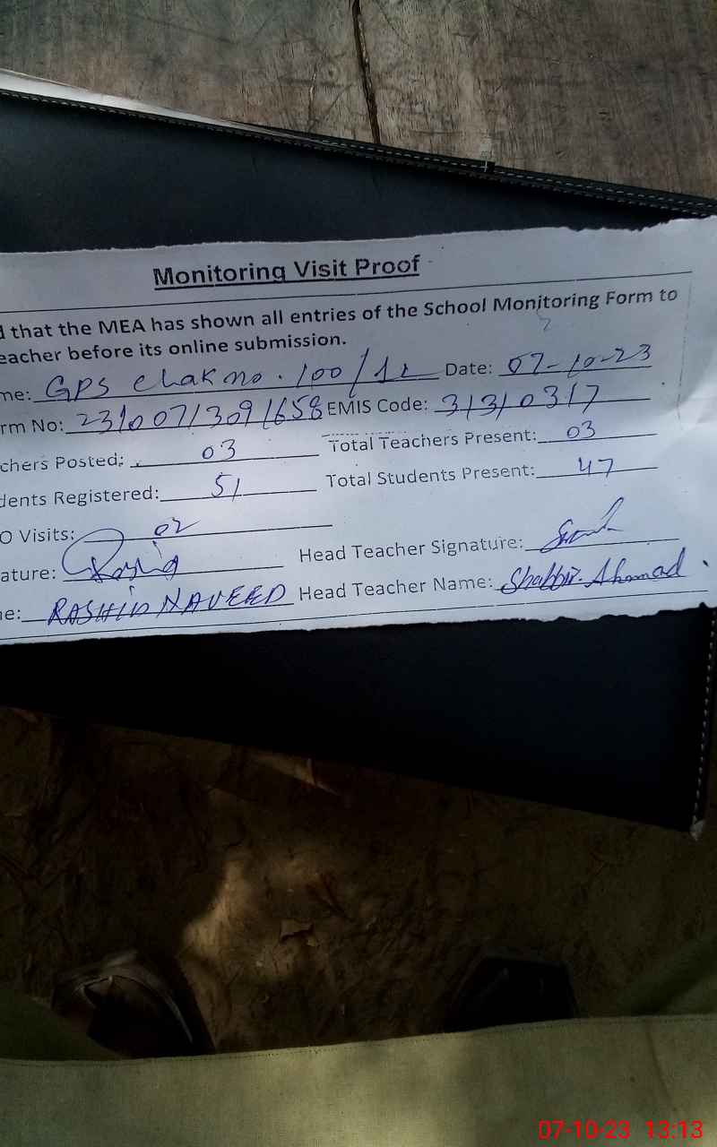 | EMIS Code: 31310317 | Name of School: GPS CHAK NO. 100/1-L | |||