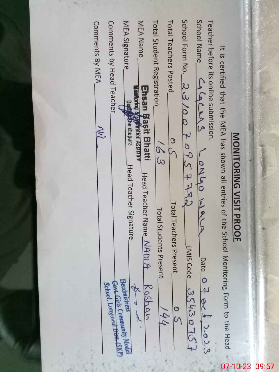 | Attendance Register | Head Teacher | MEA with School | Visit Proof |