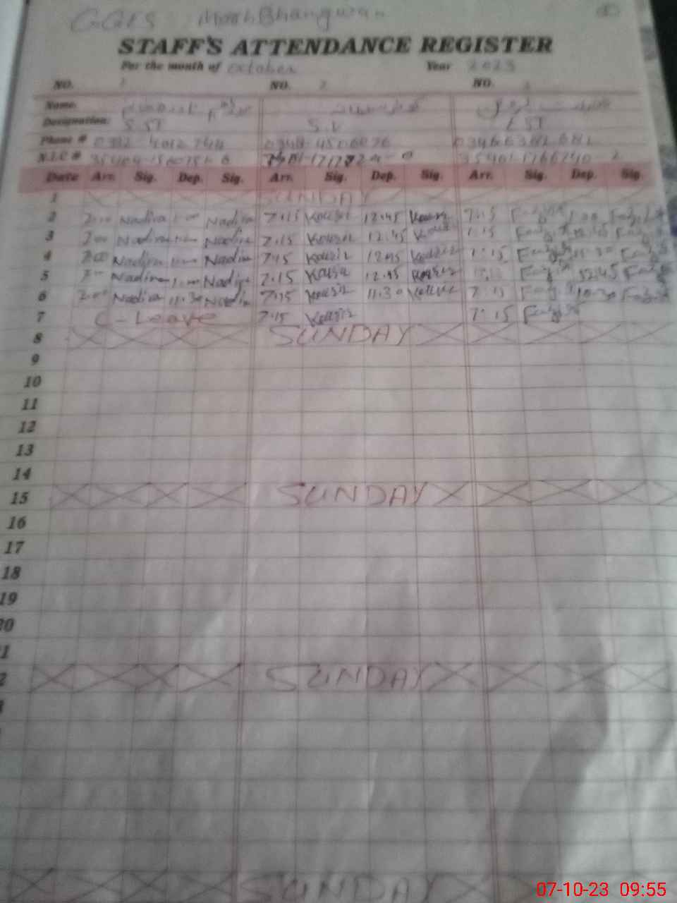 | CNIC | Full Name | Designation | R/C | Absence during last cal. month |