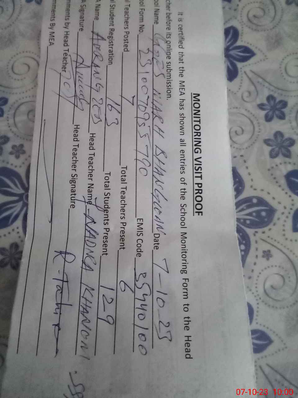 | Name: NA**** KH**** Designation: (School Headmaster's/Headmistress's) SST Phone/Cell Number: 03**** |